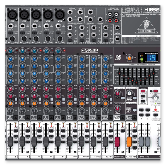 Mezclador premium de 18 entradas y 3/2 buses con preamplificadores de micrófono XENYX, ecualizador británico, procesador multiefectos de 24 bits e interfaz USB/audio